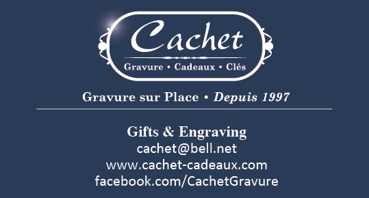 our dear customers and friends, After 22 beautiful years of operating at Centre Laval, Cachet is now in the process of relocating to a future site. In the meantime, especially for your Holiday gifts, all engraving orders can be placed by contacting us via Facebook messenger (facebook.com/cachetgravure), by email (gravuresimon@gmail.com) or by phone 514-591-2029. Thank you for your continued support and we look forward to continuing to serve you for all your engraving needs. Sincerely, Cachet Gravure et Cadeaux |